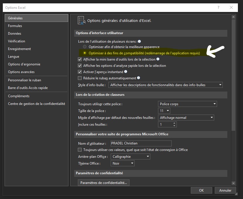 – Mettre « Optimiser à des fins de comptabilité » à la place de « Optimiser afin d’obtenir la meilleur apparence » puis OK